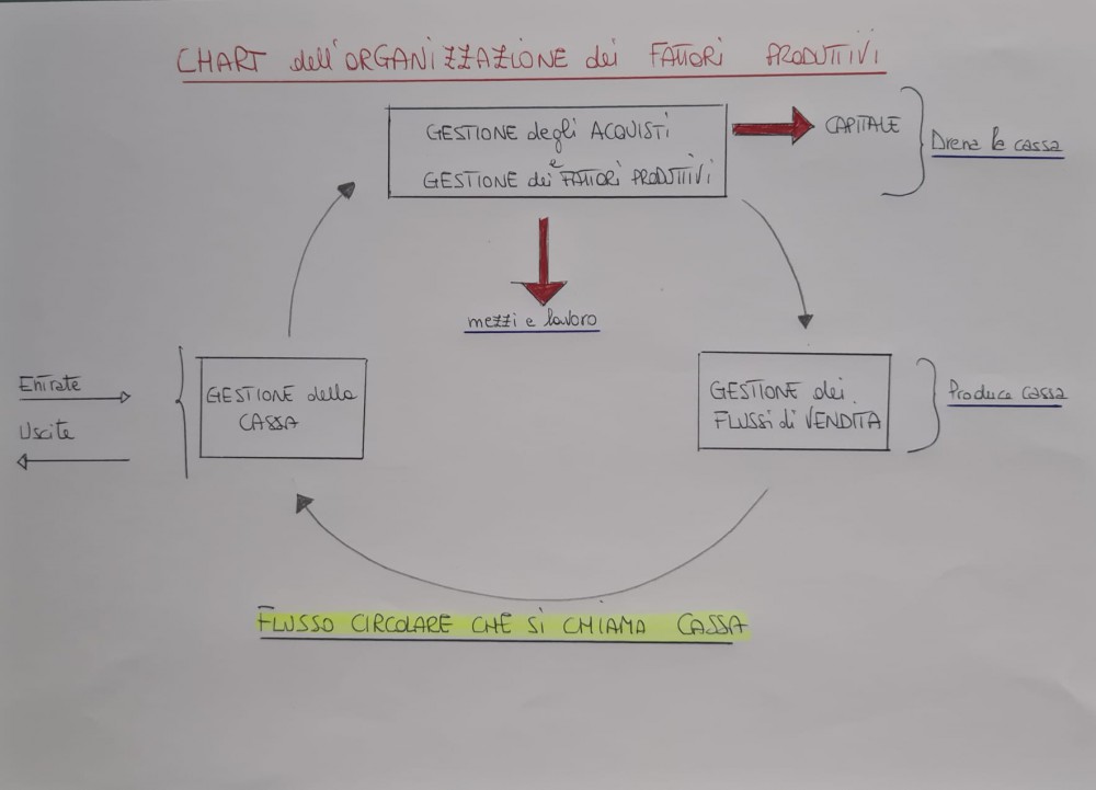 Il punto di partenza è quella parte amministrativa/contabile dell'azienda che ha ad oggetto la gestione degli acquisti e dei fattori produttivi. Per fare ciò l'imprenditore utilizza il capitale che gli serve per pagare i fornitori, per acquistare le merci, le materie prime, i servizi e il personale dipendente. In questa fase la direzione della cassa è quella di uscita. Sempre. Non ci sono alternative.
